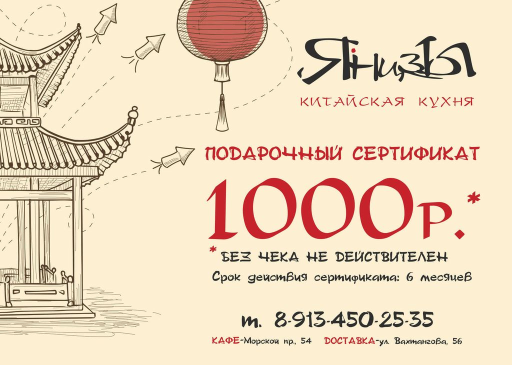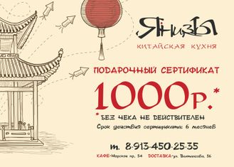 Подарочный сертификат 1000 руб. В корзину Описание Комментарии 0 Описание Подарочный сертификат Номинал 1000 ₽Приобрести подарочный сертификат вы можете при заказе доставки еды, либо по адресу ул. Вахтангова 5б и в кафе «Янцзы» на Морском проспекте 54а Комментарии 0 Нет комментариев Добавить комментарий